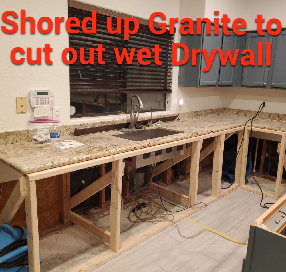 We immediately implemented a comprehensive water damage restoration plan to stabilize the property and prevent further structural damage. One of the more complex aspects of this project involved addressing the granite countertops. In emergency situations like this, our team doesn’t delay by waiting on subcontractors—we carefully brace and support granite surfaces so that demolition work behind and below the counters can proceed without delay. This approach allowed us to remove the damaged cabinets and saturated drywall quickly and efficiently.