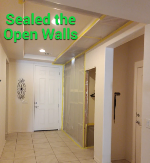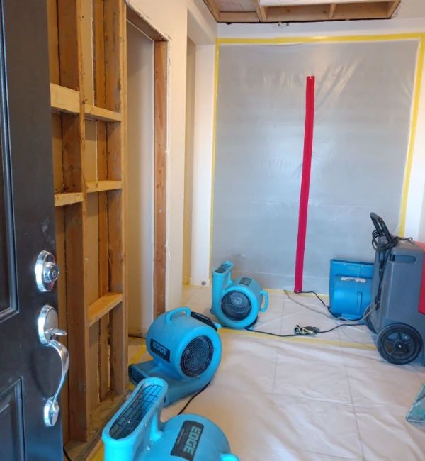 Our first step was to establish dust barriers to contain the affected area and prevent contamination to other parts of the home. We then constructed targeted drying chambers to help direct airflow and maximize the efficiency of our equipment. The source of the leak had saturated drywall and insulation, which required removal to prevent further damage and to allow proper drying.