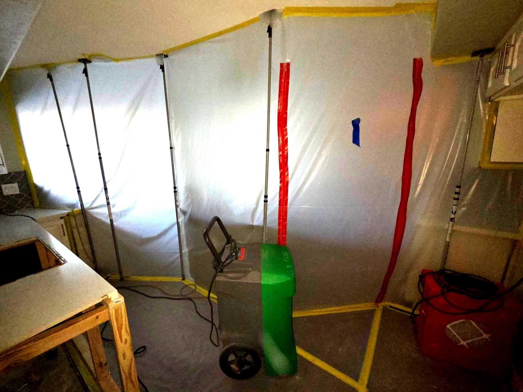 After reviewing the situation with the homeowners, our team recommended a two step remediation process. The first step was to remove and remediate all mold found on the cabinets, drywall, and interior framing, while also scrubbing and sanitizing the air in the affected area.