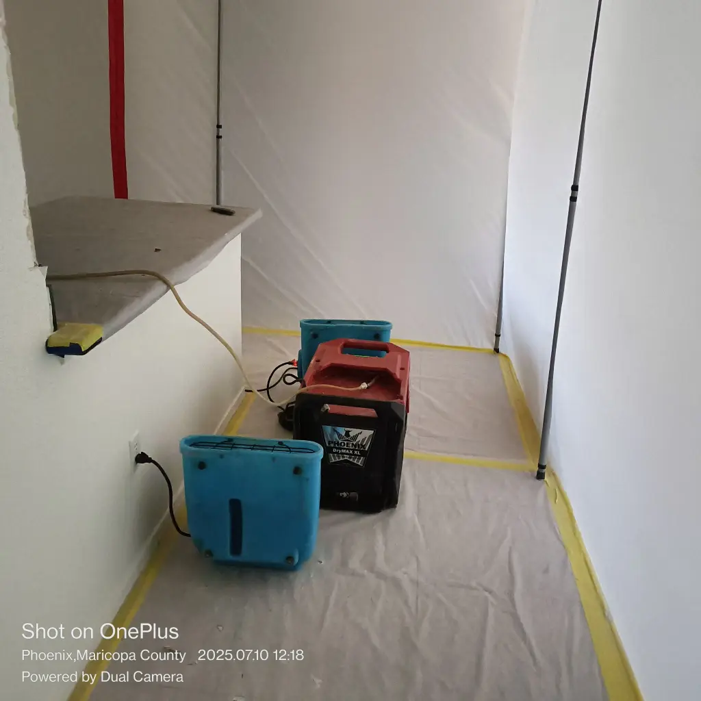Once the compromised drywall was out, we assessed the underlying framing. Mechanical drying equipment was installed to draw moisture from studs and structural members. Within a few days, the framing dried sufficiently to move toward the rebuild stages.