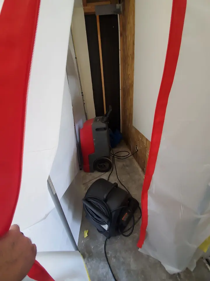 Our crew mobilized with urgency. First, we performed a detailed moisture survey to identify all affected zones. Recognizing that mold had colonized the framing material, we established containment barriers to prevent cross‑contamination, and activated negative air pressure, HEPA air scrubbers, and full PPE protocols to protect occupants and technicians alike.
