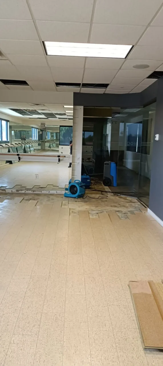Understanding that the studio layout would stay intact, Xtreme Drying focused on drying the structure without disrupting the planned renovation. The team used targeted drying methods: extracting moisture from walls and subfloors while removing ceiling tiles and insulation in the daycare below. This clever approach enabled effective drying from underneath the subfloor, speeding up moisture removal while preserving ceilings for later reconstruction.